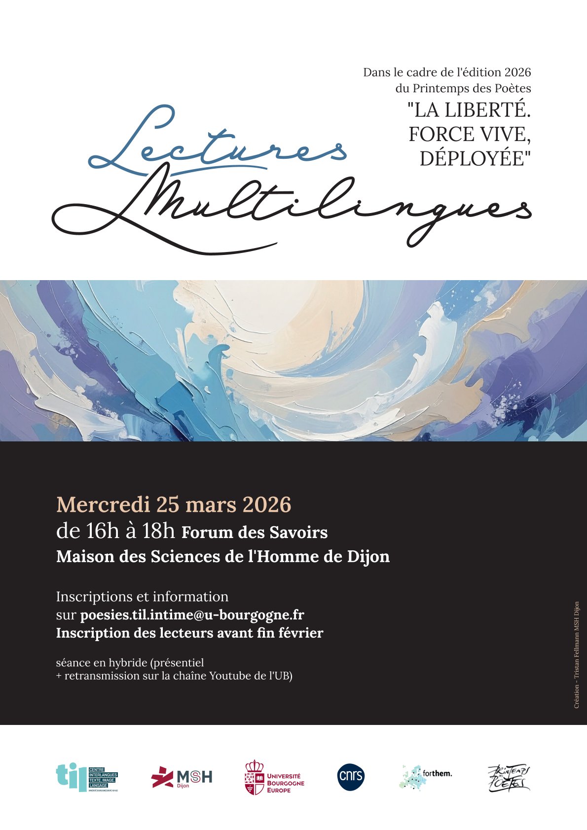 L’équipe Intime – avec le concours de l’UFR Langues et Communication et de l’Alliance Forthem – aura le plaisir de vous accueillir le mercredi 25 mars 2026 de 16h à 18h (Maison des Sciences de l’Homme) pour sa sixième lecture poétique multilingue. Après le succès de l’an dernier en mars 2025 sur le thème de « La Poésie. Volcanique », ils vont centrer cette nouvelle session poétique sur le thème de « La Liberté. Force Vive, Déployée », sujet retenu par la 28e édition du Printemps des poètes. (https://www.printempsdespoetes.com/Le-Printemps-des-Poetes)