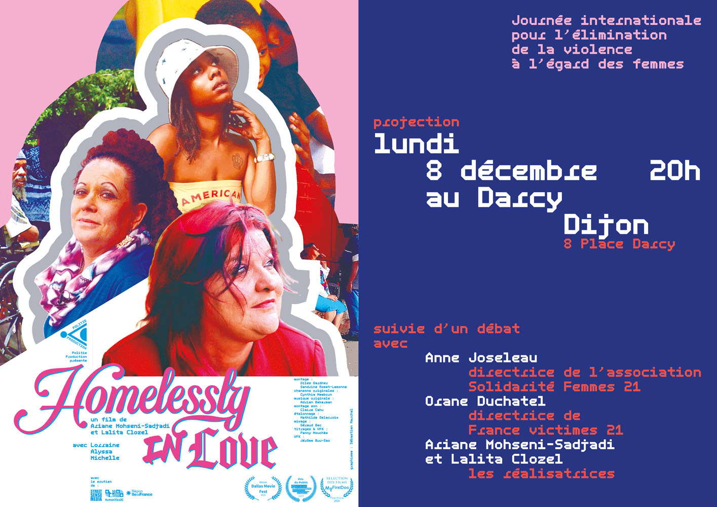 - [kc_row][kc_column][kc_column_text _id="86411"]🎥Lundi 8 décembre au Darcy à 20h🎥 Projection de Homelessly in Love, suivie d’un échange sur les violences faites aux femmes avec les réalisatrices Lalita Clozel et Ariane Mohseni-Sadjadi, Anne Joseleau, directrice de l'association Solidarité Femmes 21 et Orane Duchatel, directrice de France victimes 21🎥 Synopsis : Dans l’Amérique de Trump, trois femmes sans-abri se réinventent. Tandis qu’Alyssa, maman célibataire, brasse les faux billets de 20$ dans un clip de rap, Lorraine s’émancipe de son Freddie à grands renfort de perruques. Michelle, elle, comprend enfin comment son douloureux passé l’a poussée dans les bras d’un homme violent. Pendant cinq ans, face à la caméra, ces femmes forgées par l’adversité nous entraînent dans leurs vies tourbillonnantes où se déconstruisent féminité, parentalité et violences domestiques🎥 Tarif : 6€[/kc_column_text][/kc_column][/kc_row]