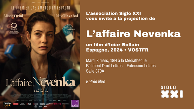 La prochaine séance du ciné-club de Siglo XXI aura lieu à la Médiathèque (salle 370A) pour le film suivant : L'Affaire Nevenka, d'Iciar Bollain (Espagne, 2024) le mardi 3 mars à 18h (VOST, 1h24). Entrée libre.