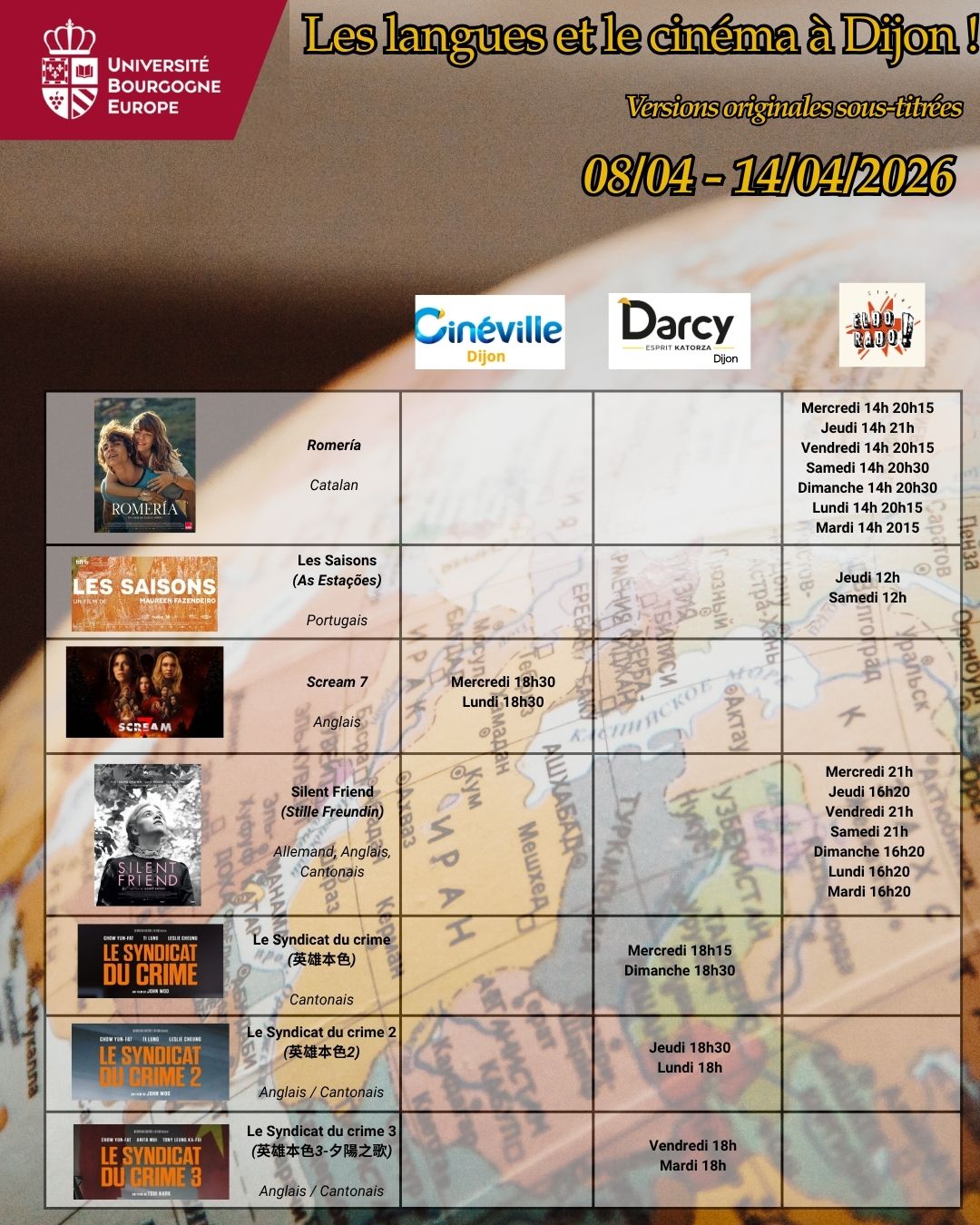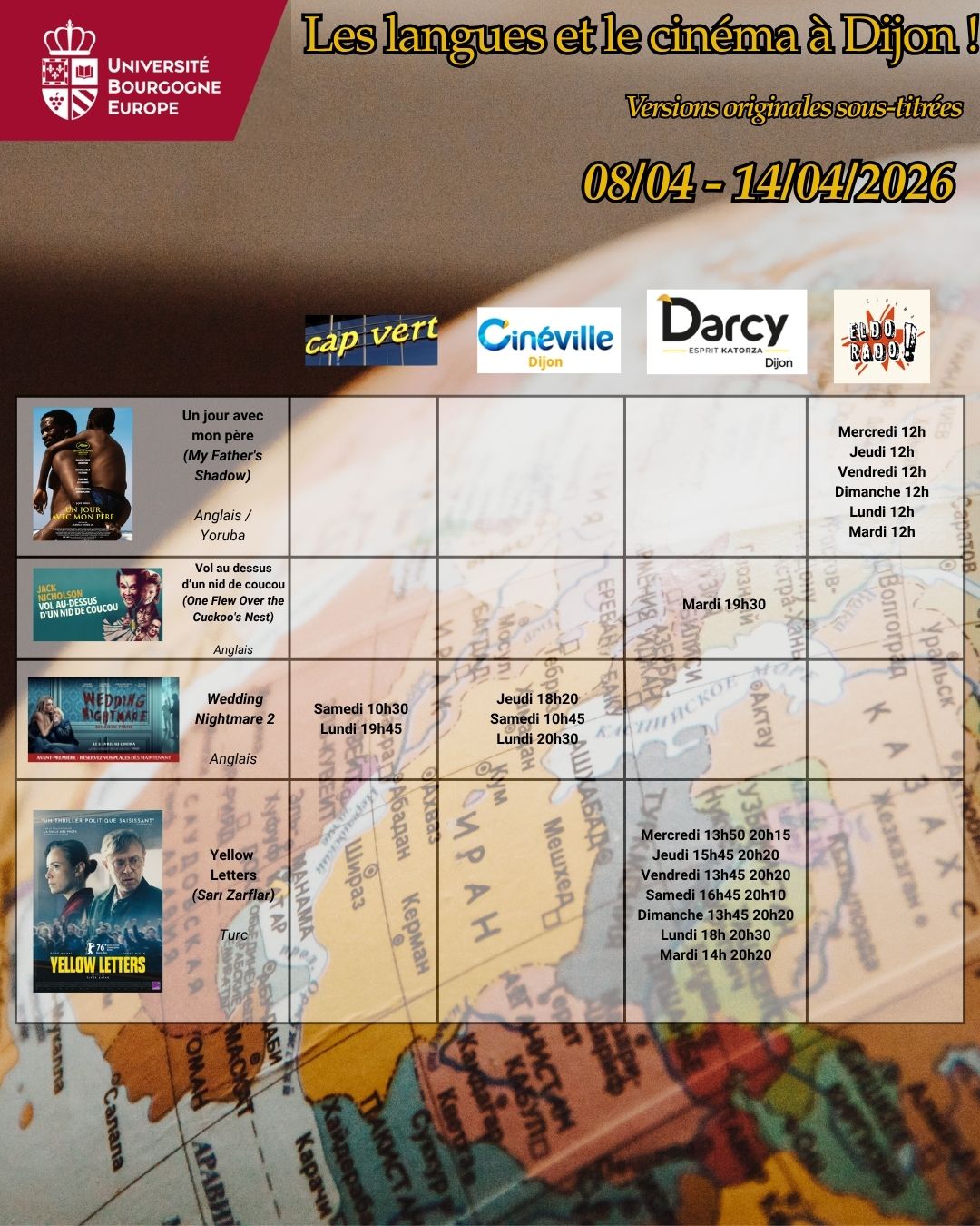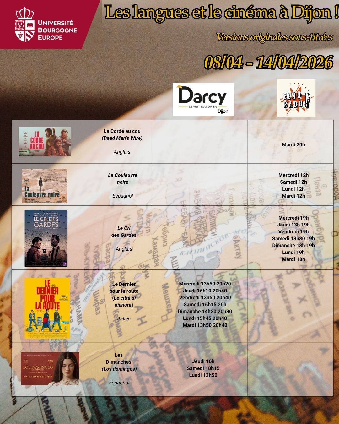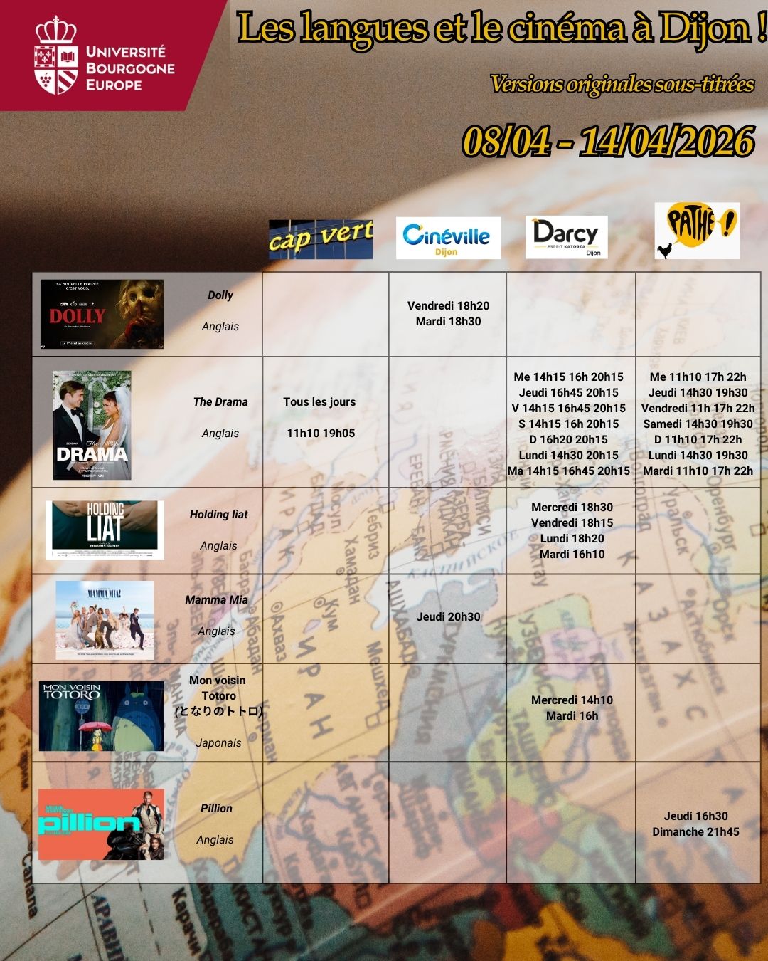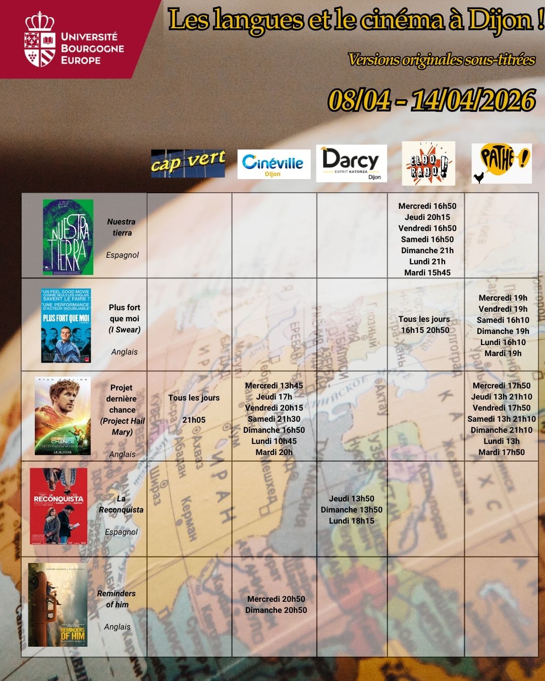 Voici les séances de cinéma en version originale sous-titrée dans les 5 cinémas de Dijon : Cap Vert, Cinéville, Darcy, Eldorado & Pathé pour la semaine du 08 au 14 avril 2026.