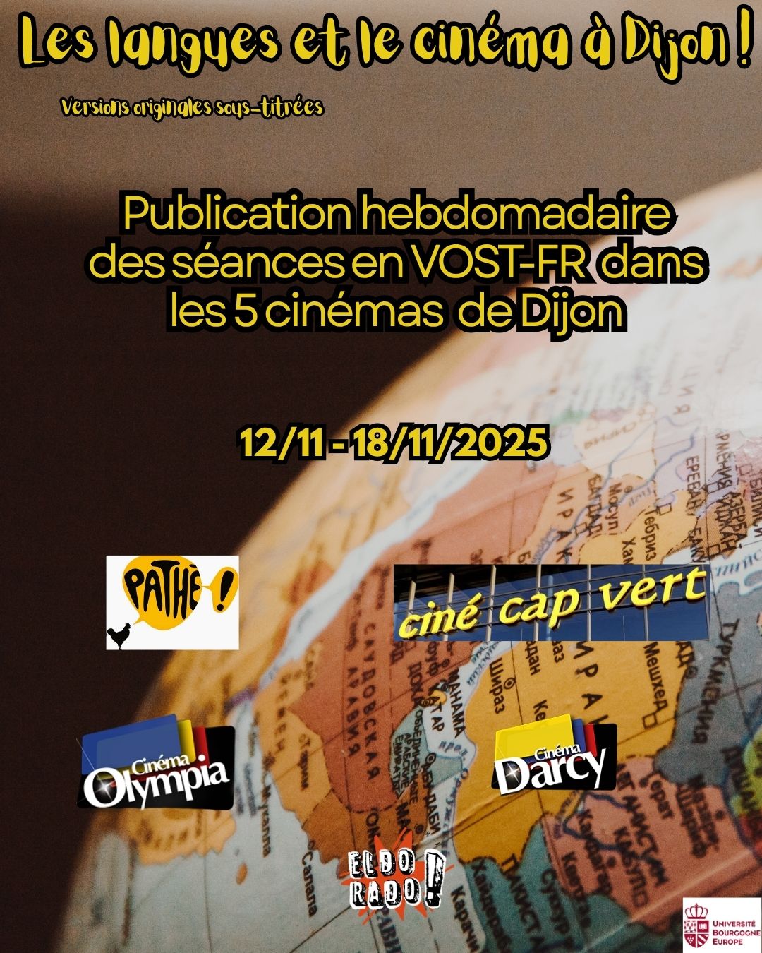 Voici les séances de cinéma en version originale sous-titrée dans les 5 cinéma de Dijon : Pathé, Cap Vert, Olympia, Darcy & Eldorado pour la semaine du 12 au 18 novembre 2025.