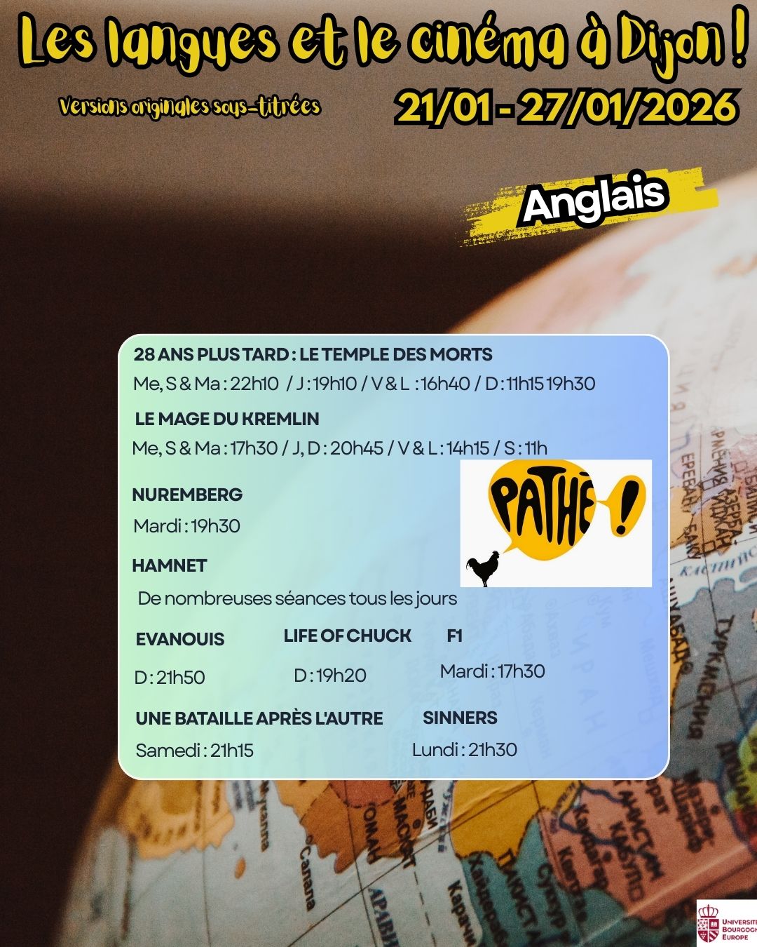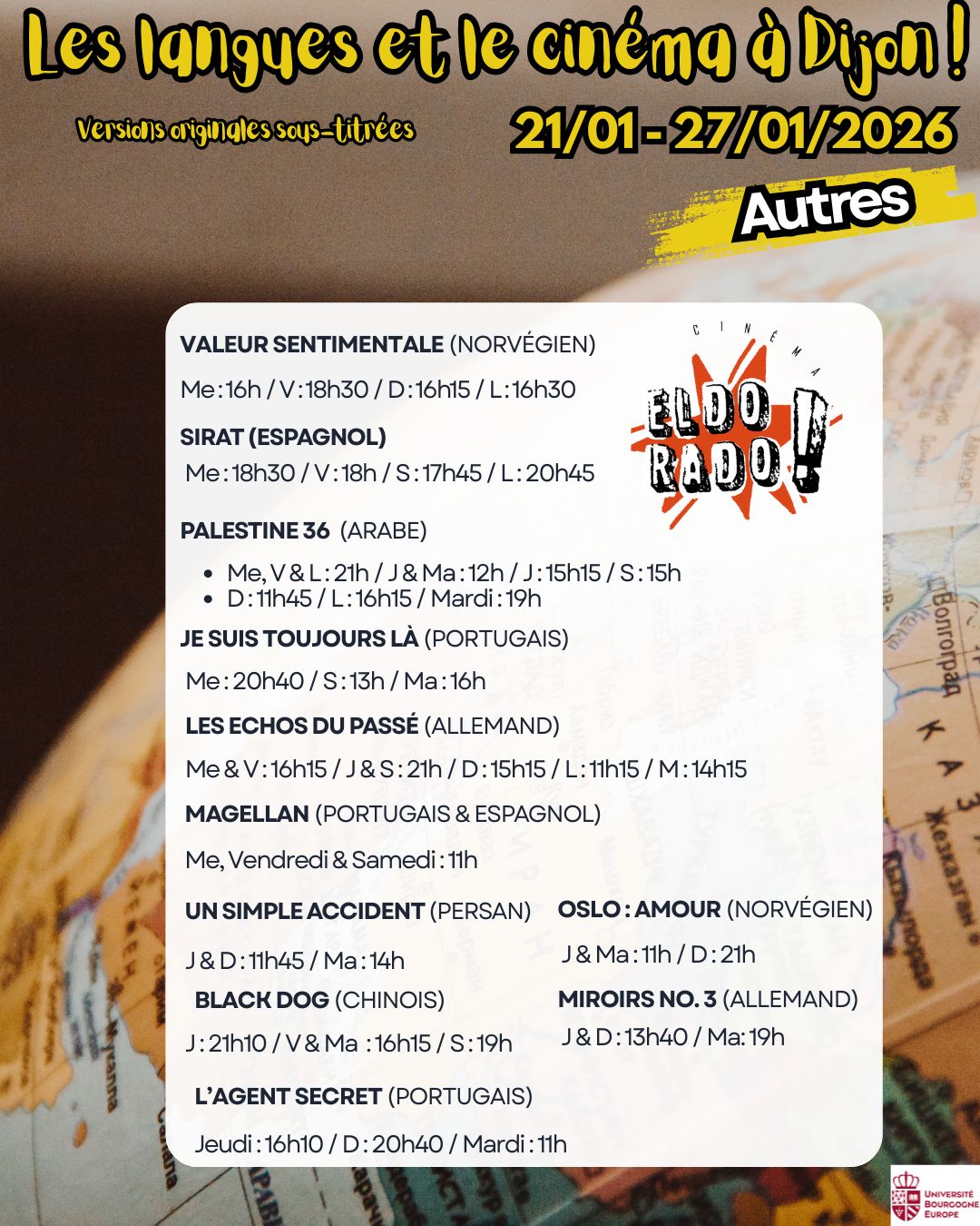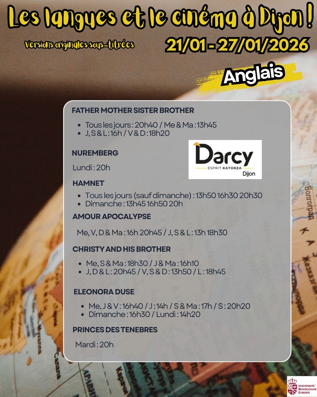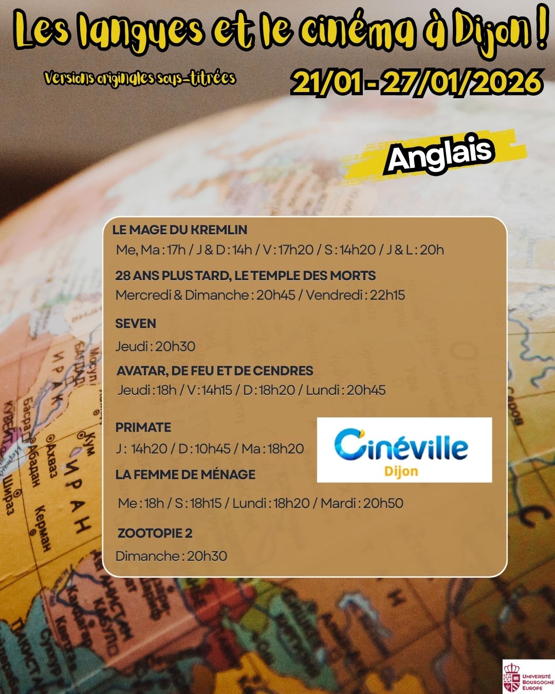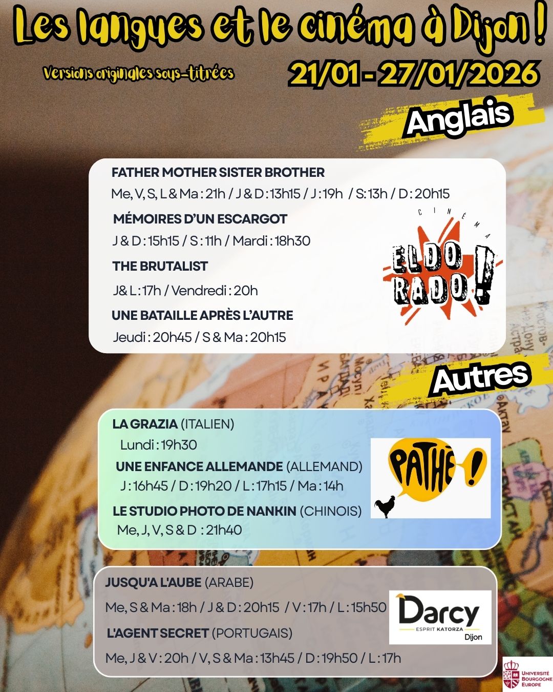 Voici les séances de cinéma en version originale sous-titrée dans les 5 cinémas de Dijon : Pathé, Cap Vert, Olympia, Darcy & Eldorado pour la semaine du 21 au 27 janvier 2026.