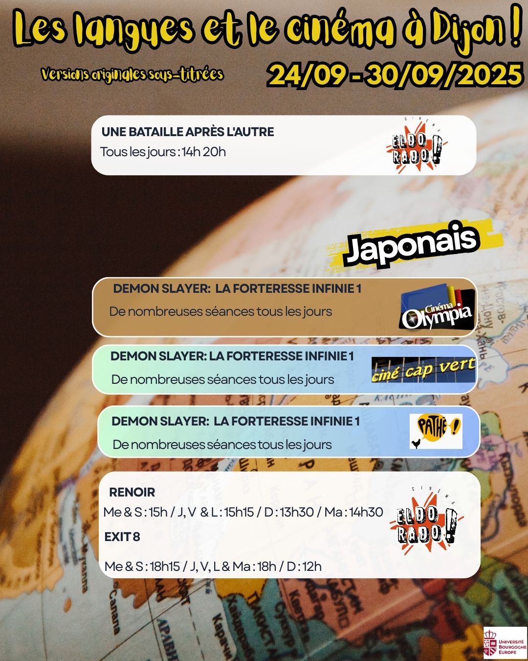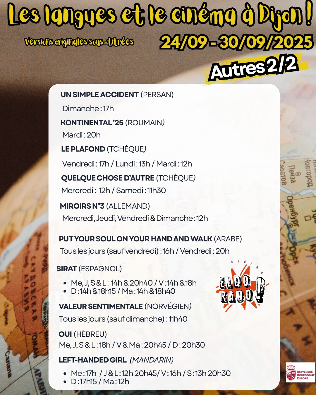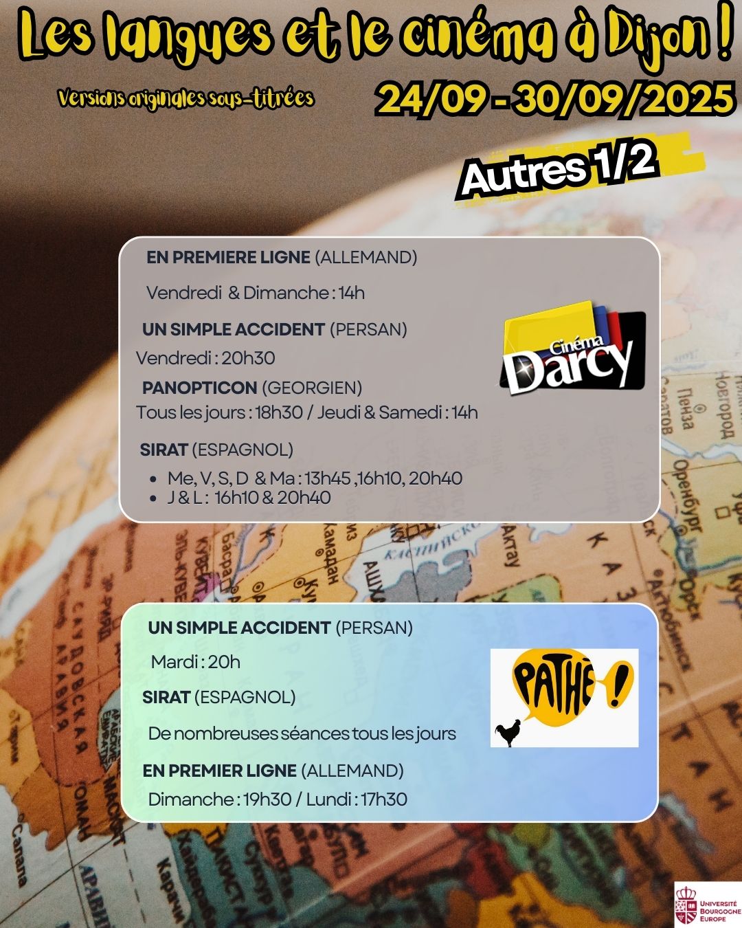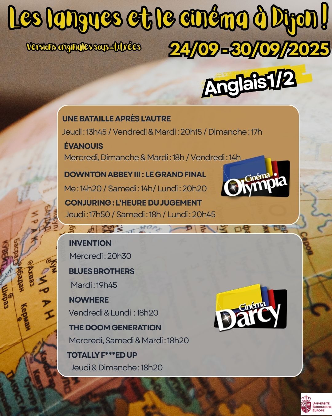 Voici les séances de cinéma en version originale sous-titrée dans les 5 cinéma de Dijon : Pathé, Cap Vert, Olympia, Darcy & Eldorado pour la semaine du 24 au 30 septembre 2025.