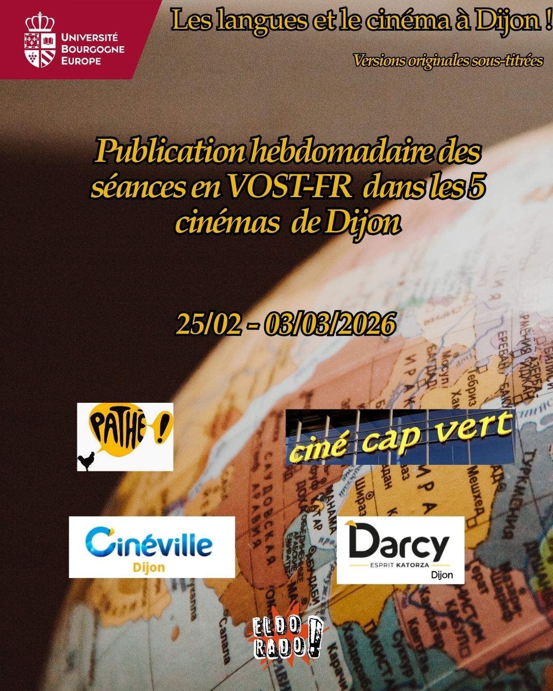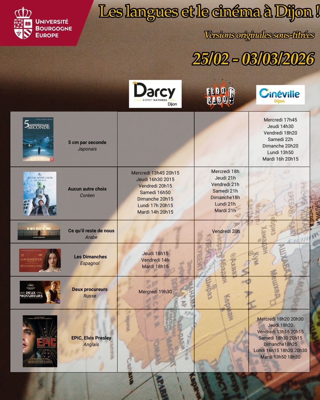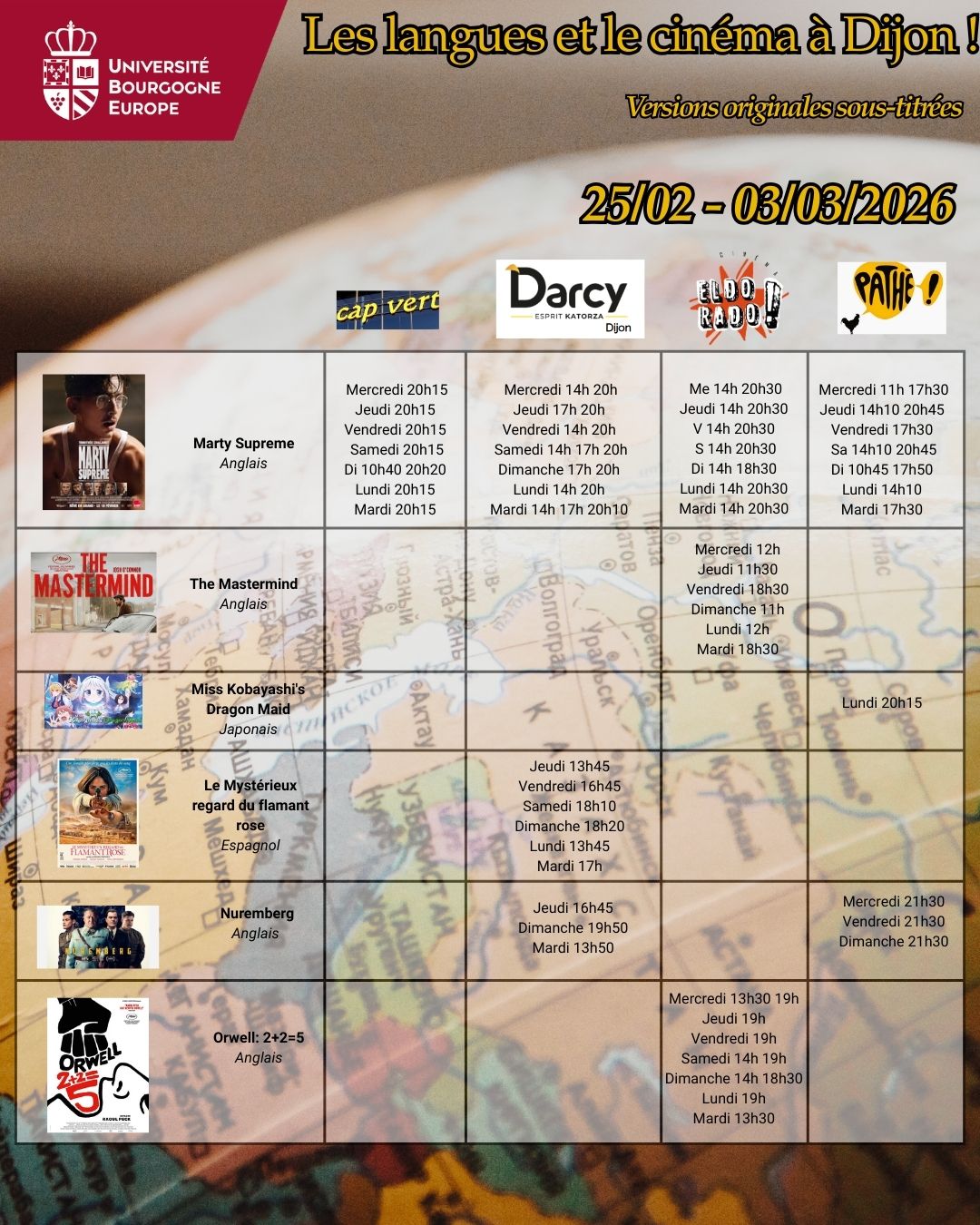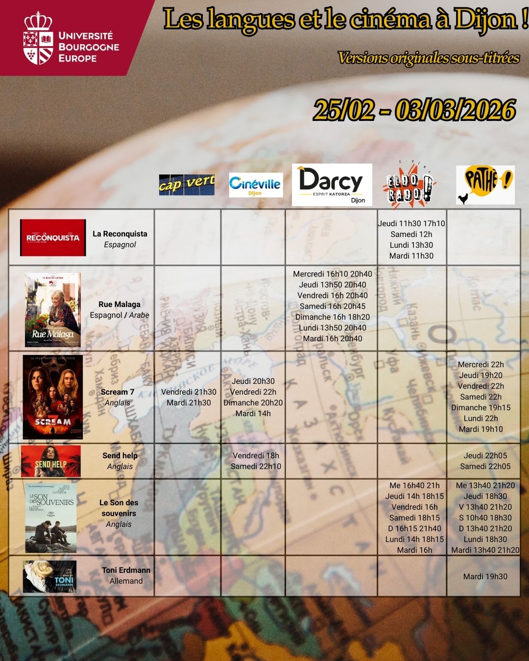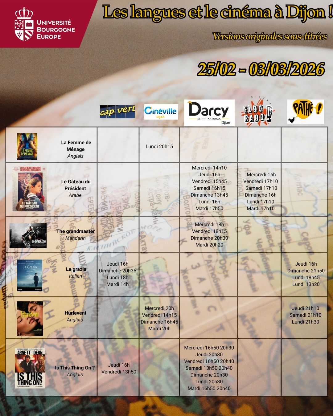 Voici les séances de cinéma en version originale sous-titrée dans les 5 cinémas de Dijon : Pathé, Cap Vert, Olympia, Darcy & Eldorado pour la semaine du 25 février au 03 mars 2026.