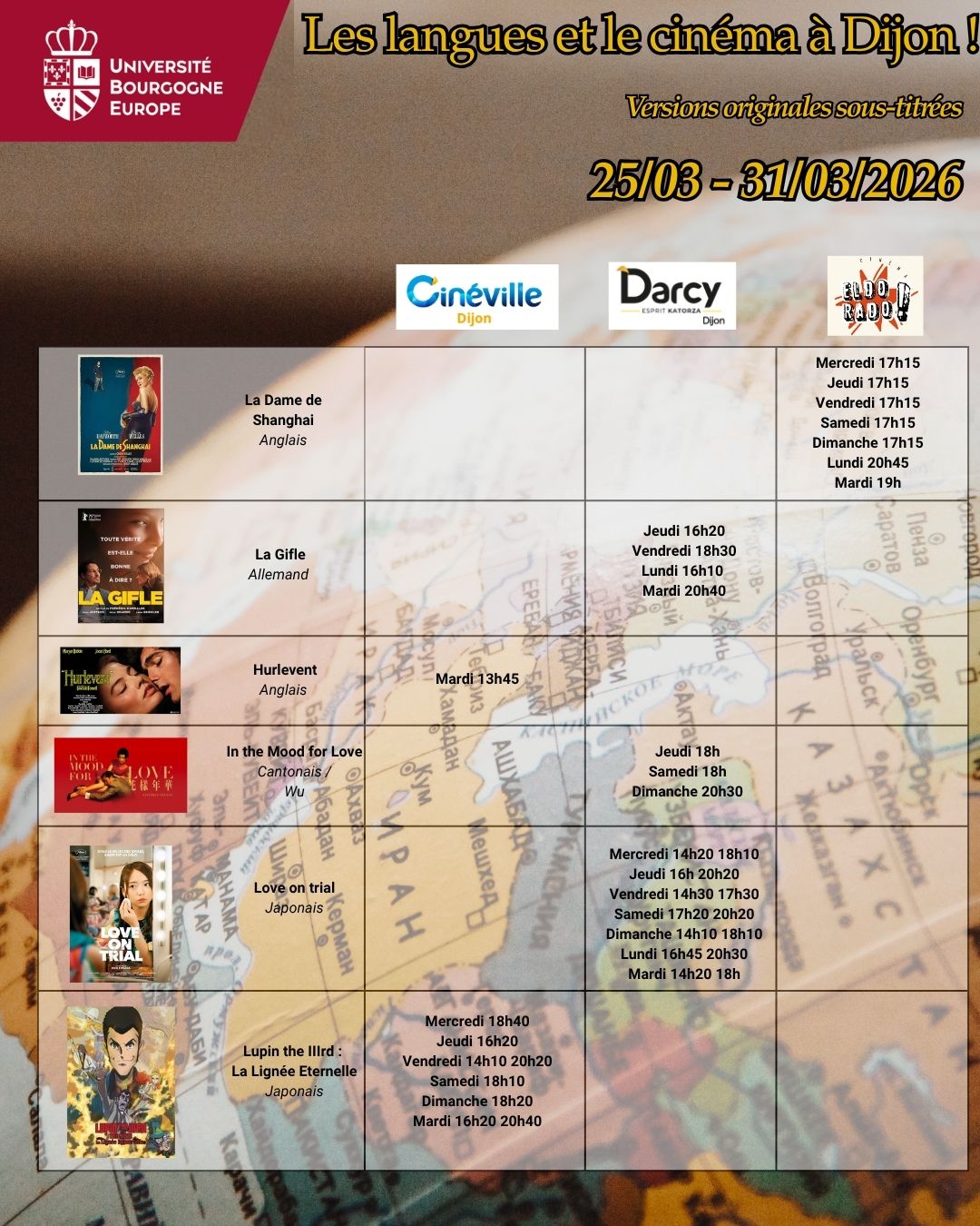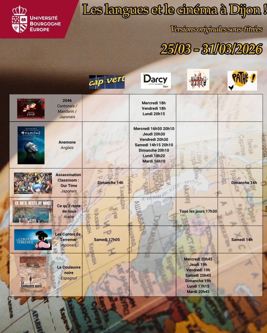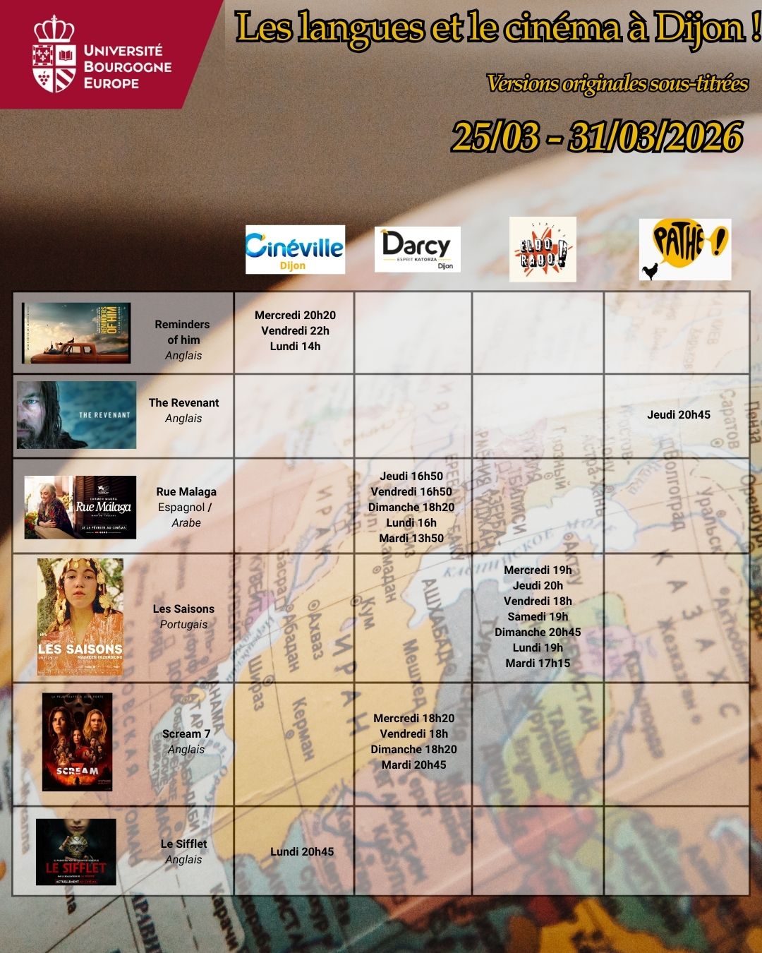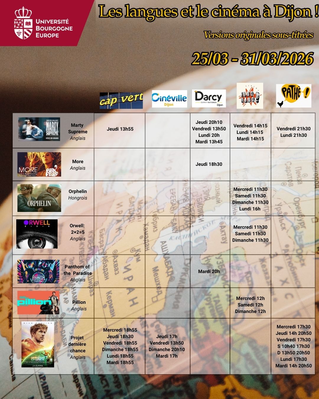 Voici les séances de cinéma en version originale sous-titrée dans les 5 cinémas de Dijon : Cap Vert, Cinéville, Darcy, Eldorado & Pathé pour la semaine du 25 au 31 mars 2026.