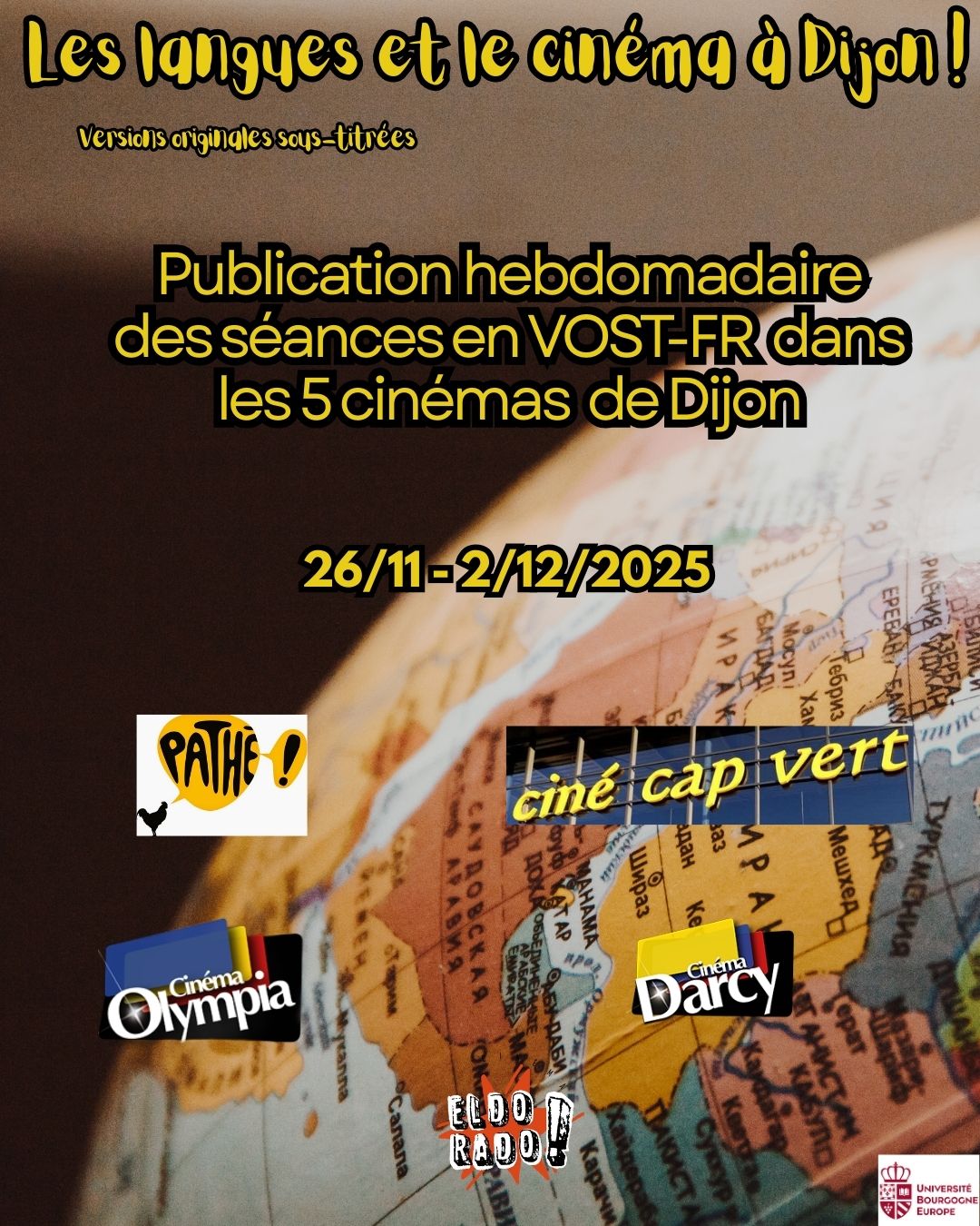 Voici les séances de cinéma en version originale sous-titrée dans les 5 cinéma de Dijon : Pathé, Cap Vert, Olympia, Darcy & Eldorado pour la semaine du 26 novembre au 2 décembre 2025.