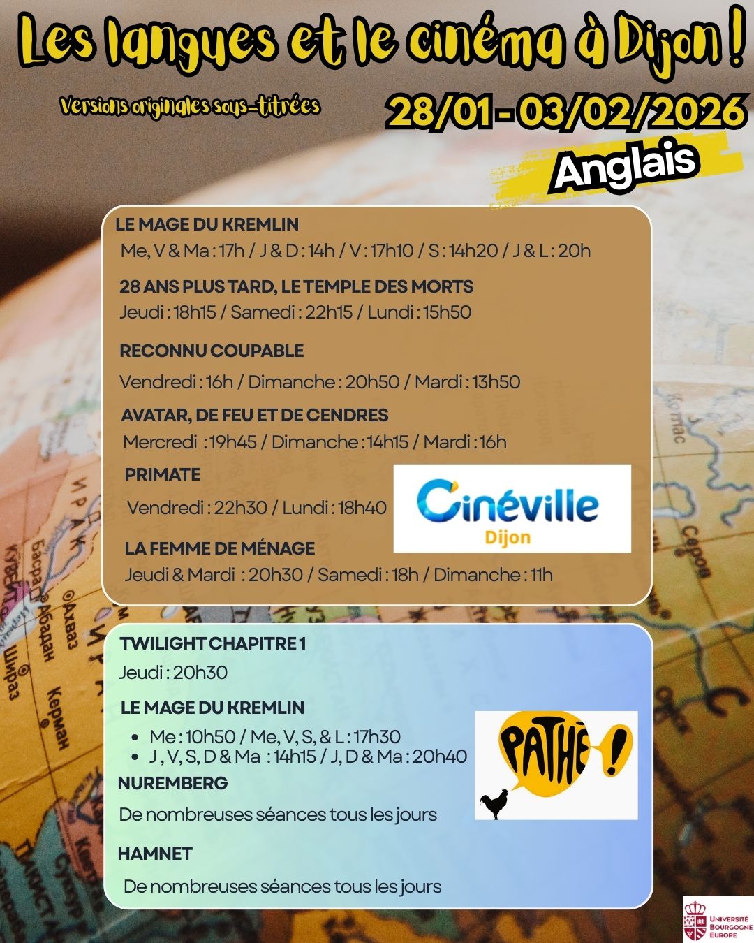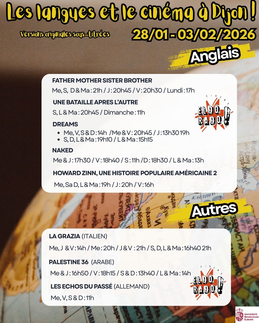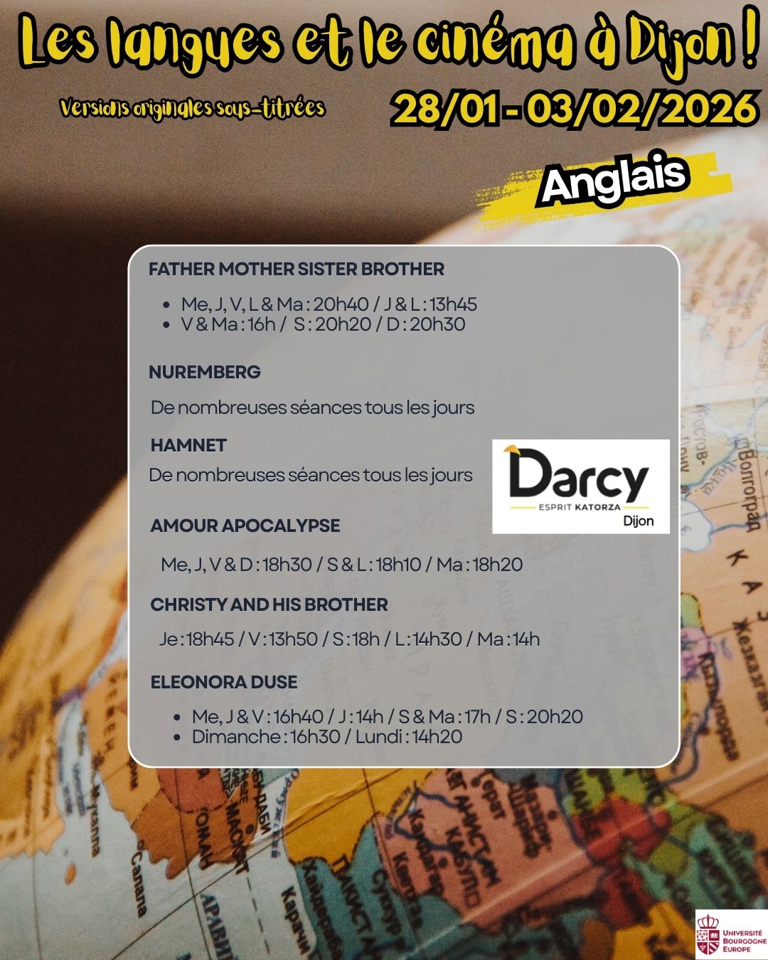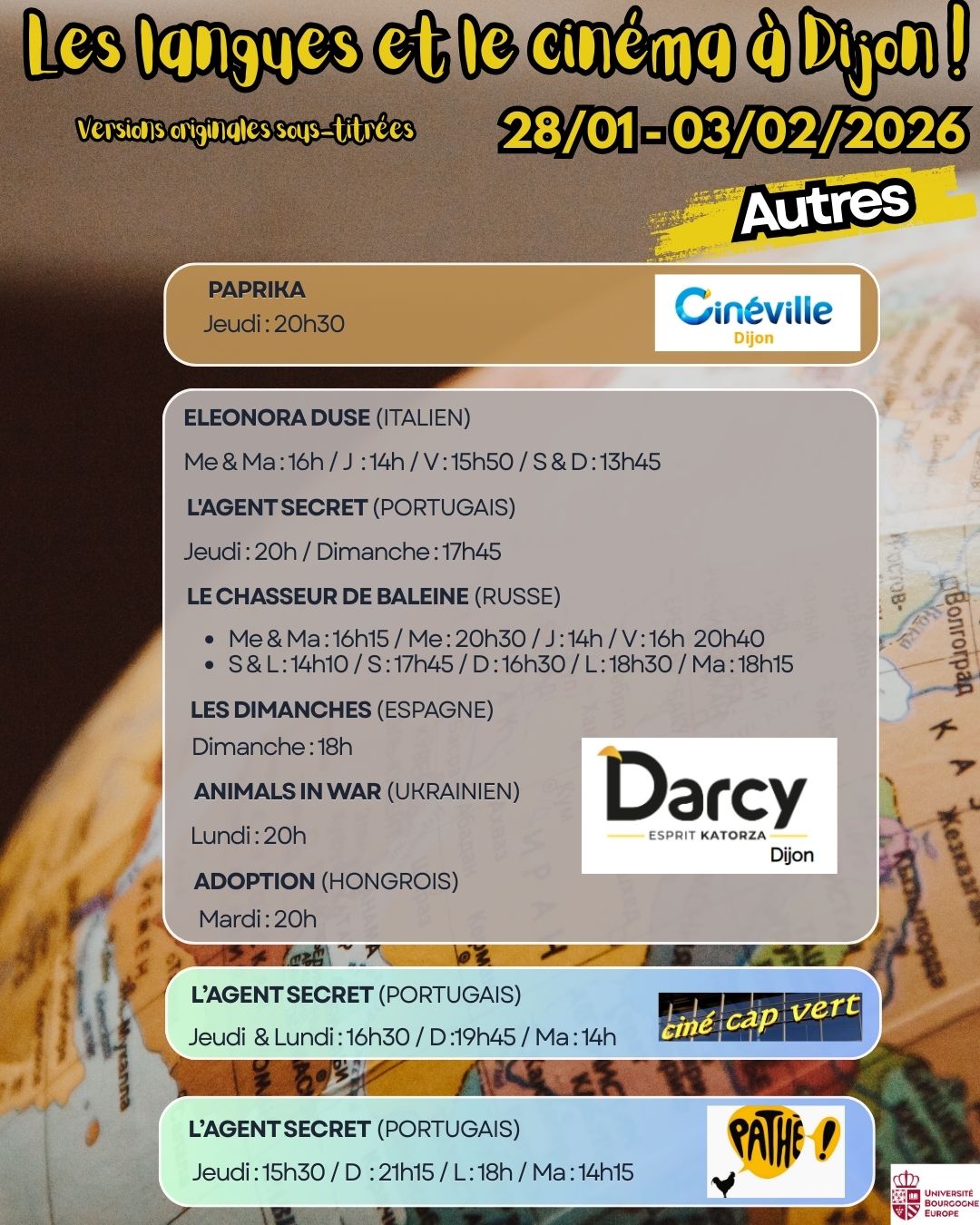 Voici les séances de cinéma en version originale sous-titrée dans les 5 cinémas de Dijon : Pathé, Cap Vert, Olympia, Darcy & Eldorado pour la semaine du 28 janvier au 03 février 2026.